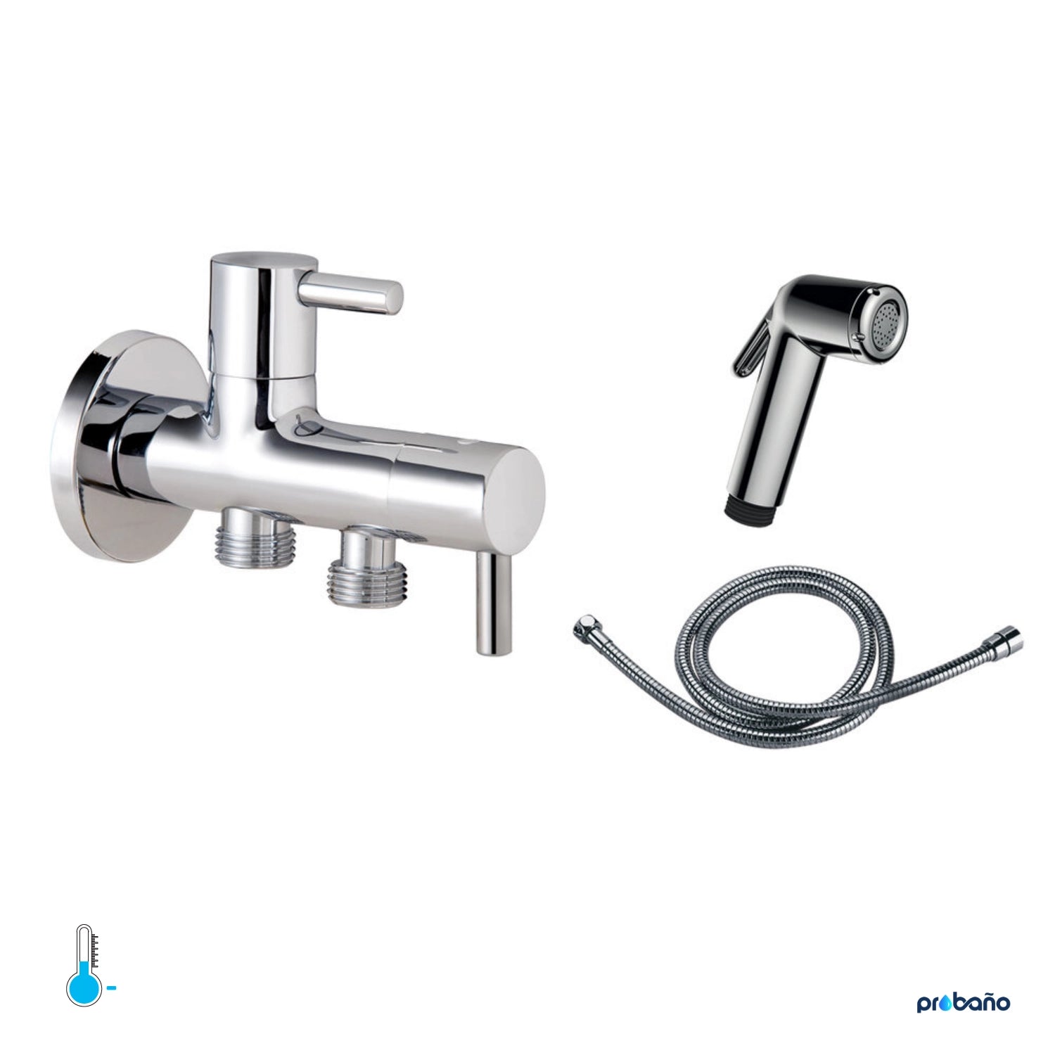 Válvula para ducha higiénica con salida cisterna. Ideal para los que desean eliminar el bidé y no quieren perder la funcionalidad, pudiendo así sustituir la actual válvula de escuadra del llenado del WC, por este Shattaf con 2 monturas cerámicas que garantizan el uso frente al paso del tiempo. Se incluyen los accesorios de flexo, soporte a pared y ducha higiénica.