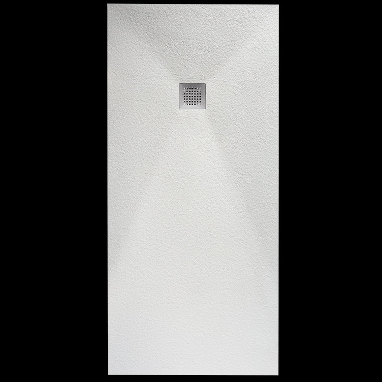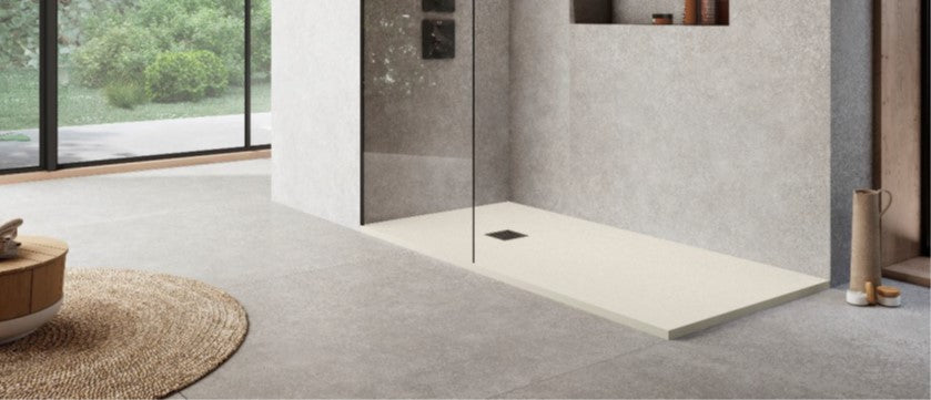 Plato de ducha rectangular Huka, fabricado con masa coloreada compuesta por un 75% de cargas minerales ligeras y un 25% de resinas de poliéster con contenido PET reciclado. Capa gruesa exterior de Gelcoat de 700 micras.