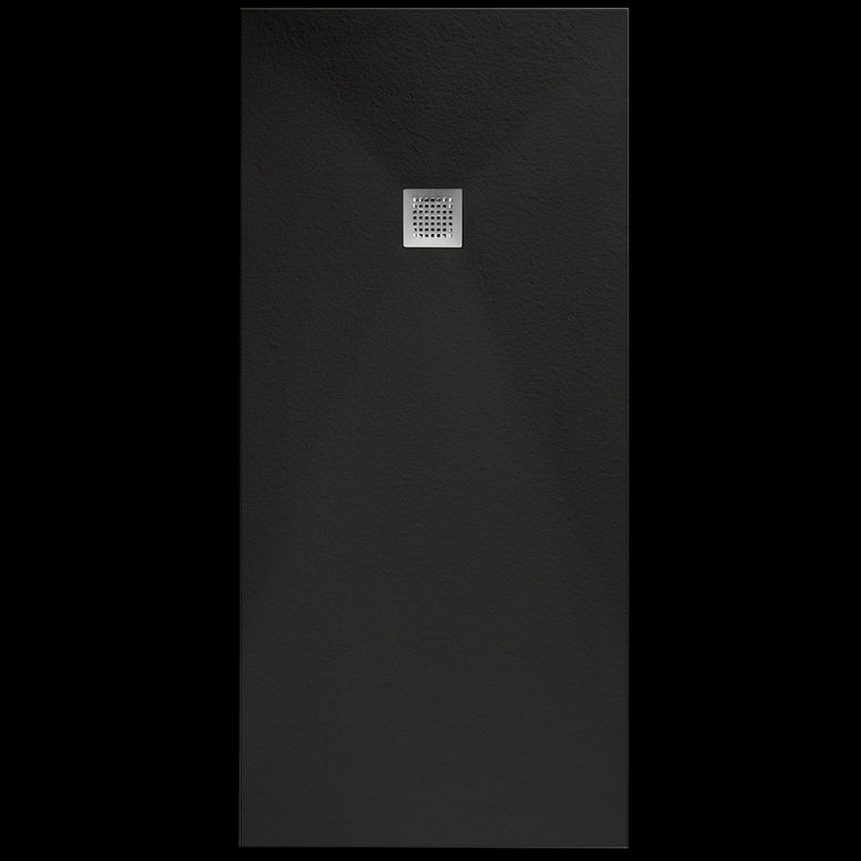 Plato de ducha rectangular Huka, fabricado con masa coloreada compuesta por un 75% de cargas minerales ligeras y un 25% de resinas de poliéster con contenido PET reciclado. Capa gruesa exterior de Gelcoat de 700 micras.